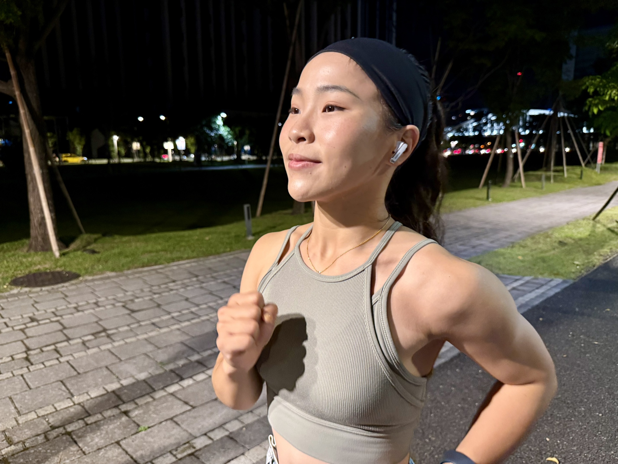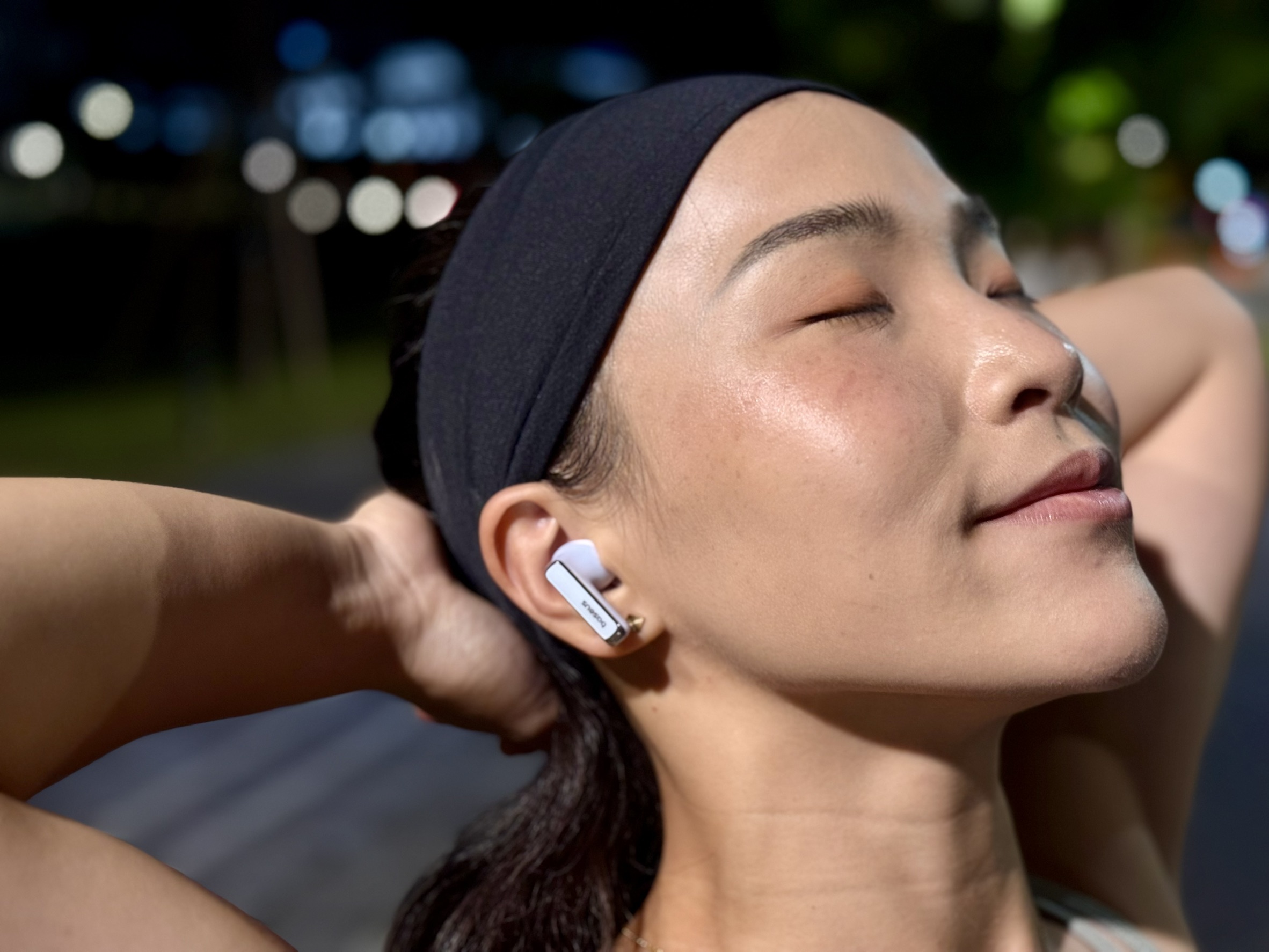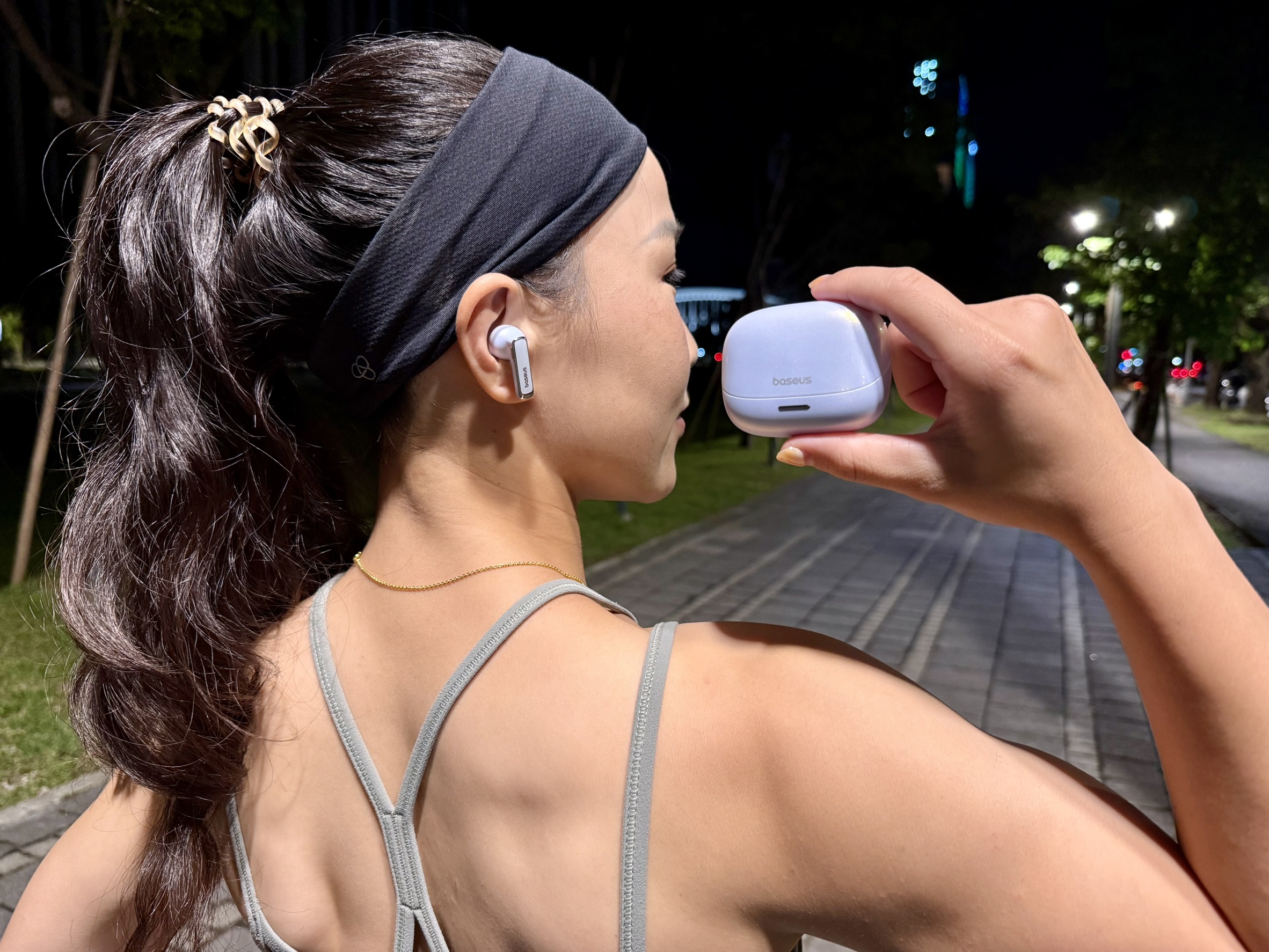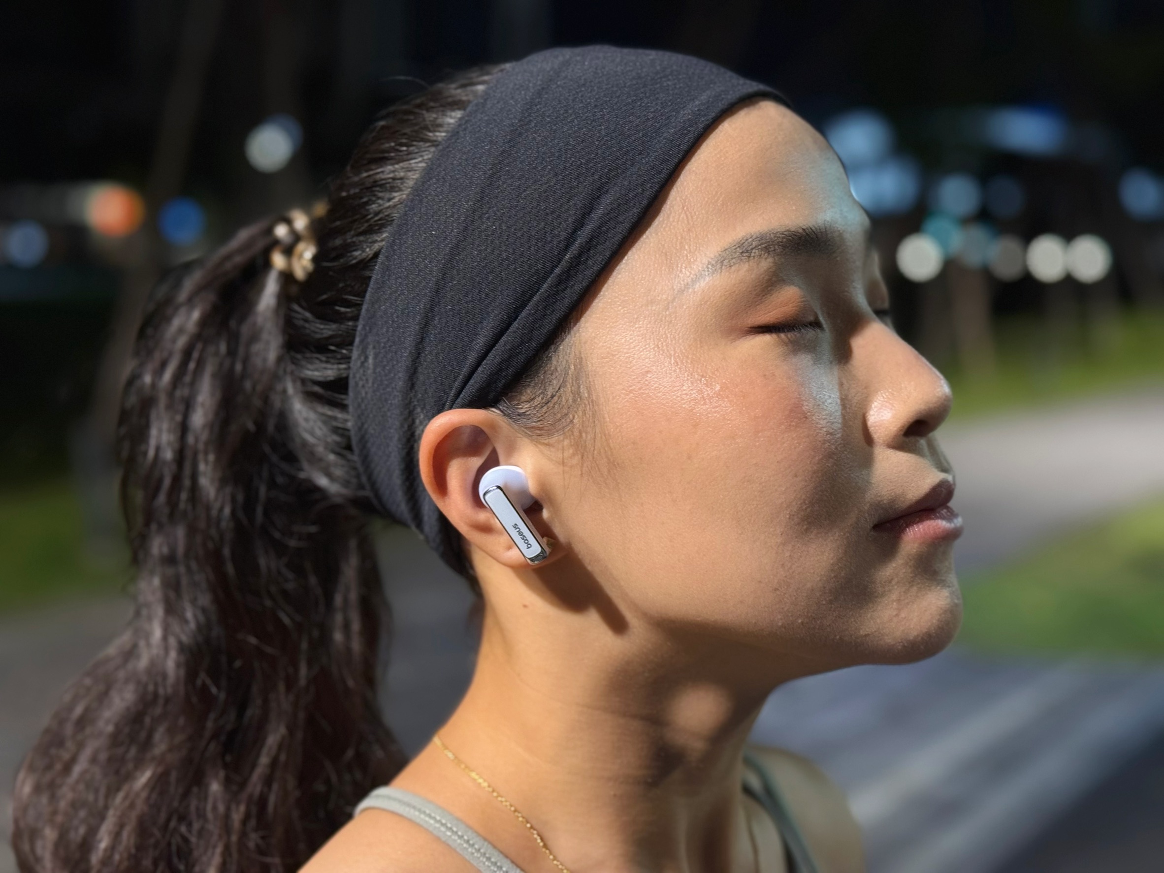 從事戶外運動配帶倍思M2s Pro,在減少風躁的同時,還能讓人隨時感知周圍動向保持安全。