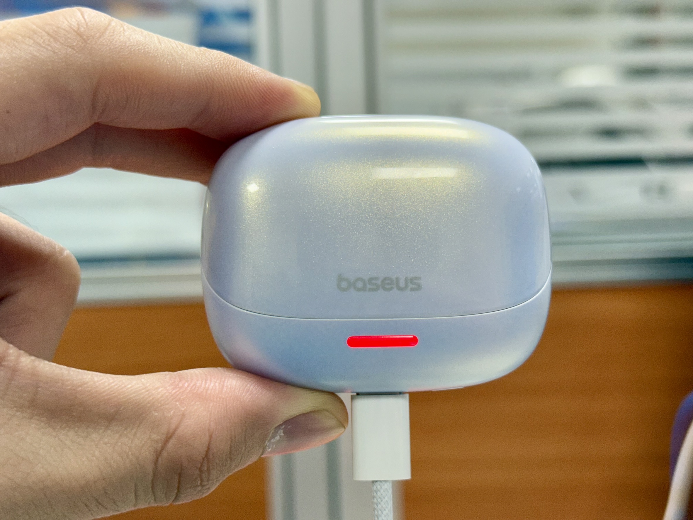 皓月白的配色在耳機、充電盒看起來是白中帶有淡淡藍色的色澤,光線照射後的反光,使它顯得頗有質感!